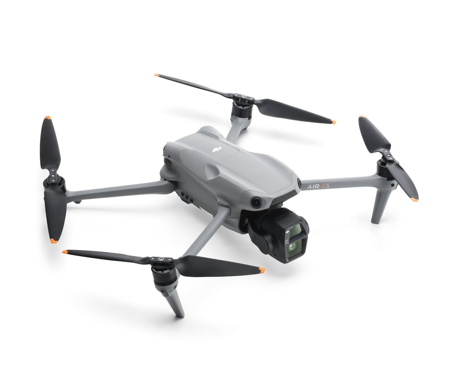 DJI Air 3s. Número de rotores: 4 rotores. Megapixeles: 50 MP, Máxima resolución de video: 3840 x 2160 Pixeles. Velocidad máxima: 27 m/s, Distancia de funcionamiento máximo: 32000 m. Tecnología de batería: Ión de litio, Capacidad de batería: 4276 mAh. Memoria interna: 42 GB, Tarjetas de memoria compatibles: MicroSD (TransFlash). Wifi, Wi-Fi estándares: 802.11a, 802.11b, 802.11g, Wi-Fi 5 (802.11ac), Bluetooth, Versión de Bluetooth: 5.2. Potencia de adaptador AC: 65 W. Color del producto: Gris