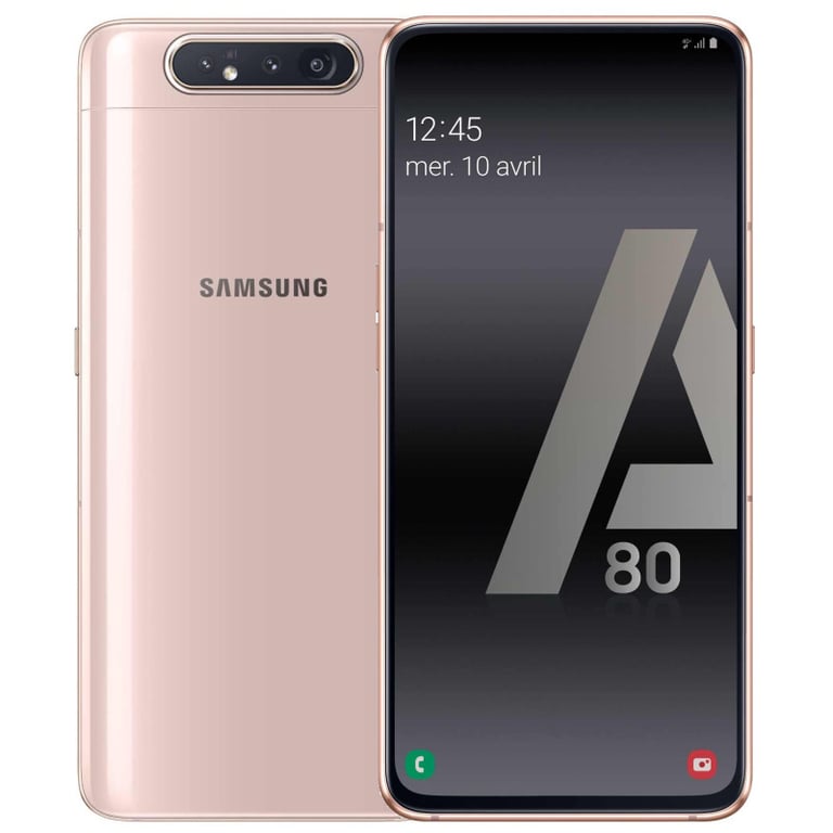 Samsung Galaxy A80 SM-A805F. Tamaño de pantalla: 17 cm (6,7"), Resolución de pantalla: 1080 x 2400 píxeles, Tipo de pantalla: SAMOLED. Frecuencia del procesador: 2,2 GHz. Capacidad de RAM: 8 GB, Capacidad de almacenamiento interno: 128 GB. Resolución de la cámara trasera (digital): 48 MP, Tipo de cámara trasera: Tres módulos fotográficos. Capacidad de la tarjeta SIM: Dual SIM. Sistema operativo instalado: Android 9.0. Capacidad de la batería: 3700 mAh. Color del producto: Rosa dorado. Peso: 220 g.