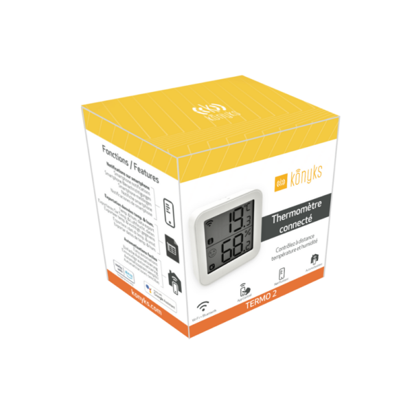 Termo 2, Termómetro e higrómetro con conexión Wi-Fi, Pantalla grande, Lectura a distancia, Activa otros dispositivos Konyks en función de las mediciones, Compatible con Alexa y Google Home.