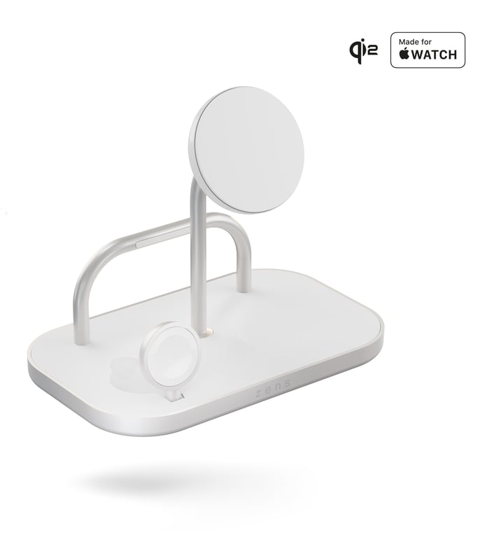 Un elegante y minimalista centro de carga diseñado para encajar a la perfección en cualquier espacio moderno. El Zens 4-in-1 Wireless Charger en blanco/plata proporciona hasta 60 W de potencia al tiempo que mantiene todos tus dispositivos organizados y listos para llevar.