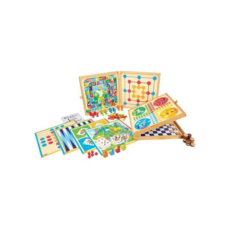 Ce set réunit plusieurs jeux classiques incontournables, dont le jeu des petits chevaux, le jeu de l'oie, les dames, la marelle, le solitaire, les échelles, le nain jaune, le jacquet et le yams. Un jeu de 54 cartes ainsi que des règles sont également inclus.