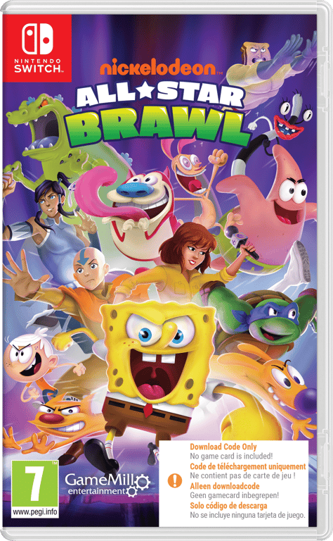 Nickelodeon All-Star Brawl est le jeu de combat Nickelodeon ultime que les fans attendaient ! Choisissez parmi les personnages les plus emblématiques des franchises Nickelodeon, dont Bob l'éponge, les Tortues Ninja, Hey Arnold, Danny Fantôme, Bienvenue chez les Loud, les Razmoket, Drôles de monstres, Invader Zim, et bien d'autres encore ! Code de Téléchargement Uniquement. Ne contient pas de cartouche de jeu ! Description Découvrez Nickelodeon All Star Brawl sur SWITCH ! Un casting de stars : Les personnages préférés des fans de l'univers des dessins animés de Nickelodeon sont là et chaque combattant offre un style de jeu et un ensemble de mouvements uniques à maîtriser pour envoyer vos ennemis voler hors du niveau pour gagner. 20 niveaux sur le thème de Nickelodeon : Combattez à travers une variété de niveaux inspirés des univers emblématiques de Nickelodeon, y compris les Champs de Méduses de Bob l'éponge, le Technodrome de Tortues Ninja, et plus encore ! Modes de jeu solo et multijoueur : Améliorez vos compétences contre l'IA, ou affrontez-vous dans un mode multijoueur en ligne ou en local jusqu'à quatre joueurs. Contenu bonus : Débloquez des mouvements avancés propres à la personnalité de chaque personnage et bien plus encore dans la galerie du jeu ! EDITEUR GAMEMILL GENRE Party-Game, Combat, Plateforme SUPPORT Code de téléchargement PLATEFORME Nintendo Switch CLASSE D'ÂGE PEGI 7