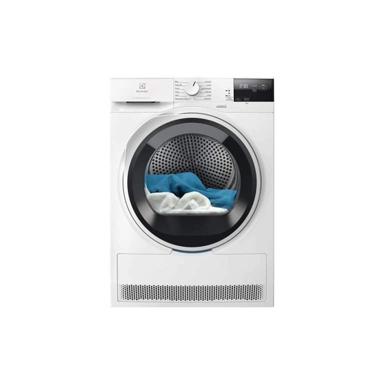 Sèche-linge pompe à chaleur Electrolux EW6HI6284BN - Capacité 8 kg avec séchage électronique précis pour s'adapter à chaque charge - 12 programmes pratiques dont Draps XL pour les grandes pièces et MixCare pour sécher ensemble coton et synthétiques sans tri - Options avancées comme le réglage du degré de séchage, anti-froissage et minuterie pour un cycle sur mesure - Technologies SensiCare pour ajuster automatiquement la durée selon l'humidité et éviter le surséchage - Tambour inox de 118 L avec rotation bidirectionnelle pour un séchage uniforme et un linge moins froissé - Moteur Inverter silencieux et économe - Filtre EasyClean double face pour un nettoyage ultra rapide et des performances durables - Eclairage LED intérieur et indicateurs de nettoyage filtre, bac plein et condenseur pour un usage confortable au quotidien - Fonctionne entre 5 °C et 35 °C - Porte réversible avec 4 positions d'ouverture et 4 pieds réglables pour une intégration facile - Design soigné avec hublot noir anthracite et poignée blanche.