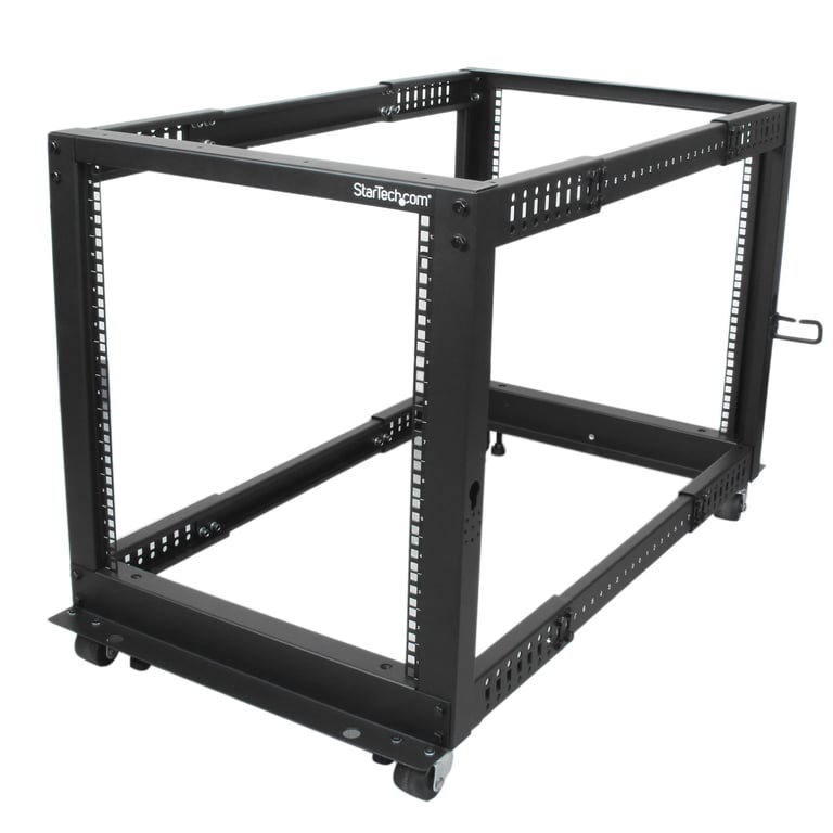 - ACIER ROULÉ À FROID : Rack 19" à cadre ouvert conçu pour la ventilation avec une hauteur de montage de 12U et une capacité de 544kg (stationnaire); 3 options d'installation incluses : roulettes/pieds de mise à niveau ou plaque de base pour le fixer au sol