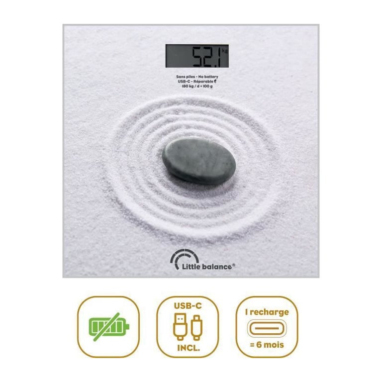 Scegliete la tranquillità con la bilancia Zen USB-C di LITTLE BALANCE. Priva di batteria, può essere ricaricata tramite USB di tipo C con il cavo in dotazione. La batteria agli ioni di litio sostituibile e la base in plastica riciclata al 100% la rendono una scelta ecologica. In grado di sostenere fino a 180 kg con una precisione di 100 g, è dotata di una piattaforma in vetro temperato di 28x28 cm e di uno schermo LCD per una facile lettura.