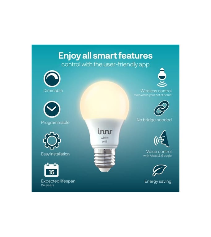 INNR E27 Connected Bulb -Wifi Direct - Confezione da 2 Bianco caldo 2700 K Intensità regolabile.