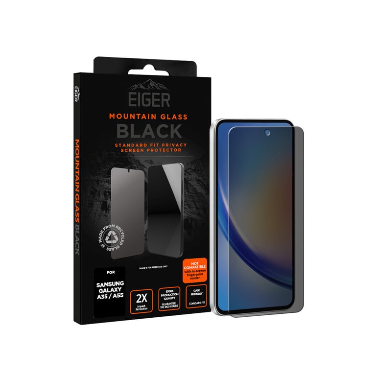 Proteggi il tuo Samsung Galaxy A35 / A55 con il vetro temperato premium speciale PRIVACY di Eiger. Nasconde le informazioni laterali, ultra resistente, trattamento oleofobico, resistenza 9H, spessore di 0,33 mm.